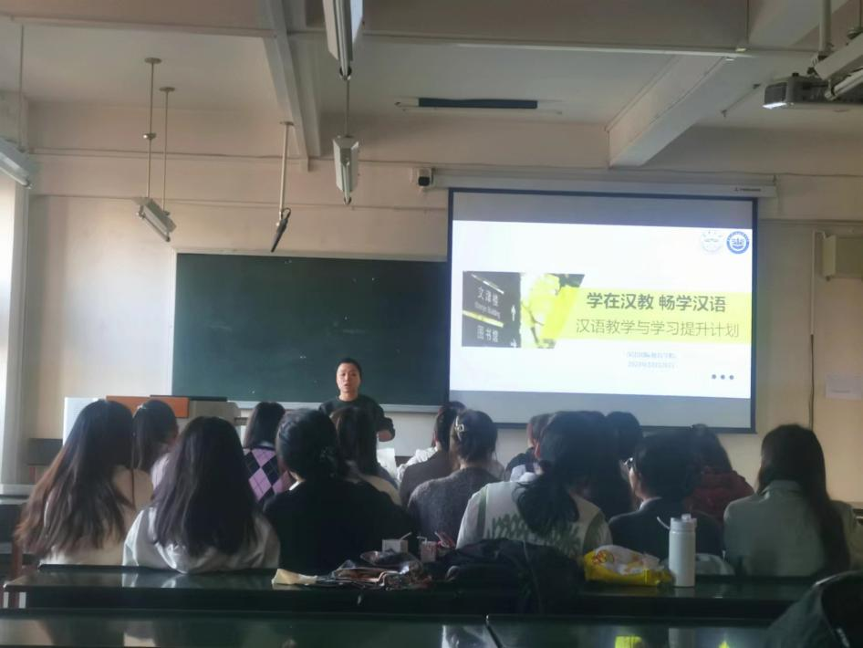 为进一步提升公司国际员工的汉语学习能力,帮助员工顺利通过HSK5级考试,同时给汉语国际教育专业硕士研究生提供更多教学实践机会,提高汉硕研究生汉语教学能力,2023年10月至12月,公司组织开展为期两个月的“学在汉教,畅学汉语:汉语教学与学习能力互助提升计划”活动。为保证活动质量,本次活动开始前邀请汉语言教研室主任杨子琴老师开展培训,活动中邀请有丰富海外汉语教学经验的2023级硕士杜忠廷、杨雨蒙全程指导。
