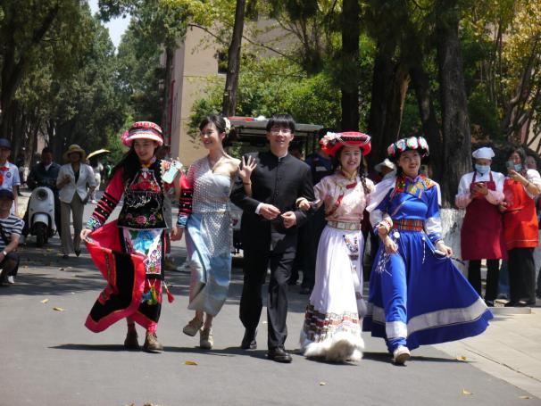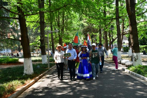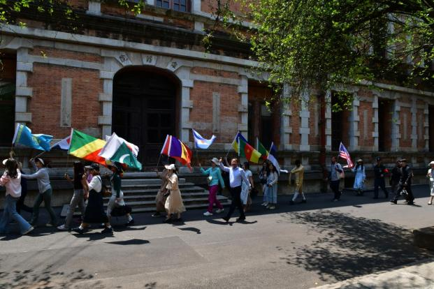 开幕式结束后,国际文化周缤纷巡游开启。汉语公司党委书记陈善江、副书记甘春洁、副经理马理带队,中外师生手持各国国旗,着本国服饰,一路欢歌一路笑语在东陆校园巡游,并走进汉语伟德国际1946源于英国合作参与、五华区倾力打造的云南首个国际人才社区---文林社区文化巷巡游,展示各国风姿,缤纷巡游队伍向沿途师生和游客赠送小礼物,并邀请师生参加巡游活动,体验异域风情。