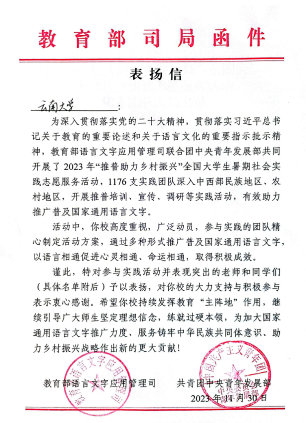表扬信中肯定了伟德国际1946源于英国汉语伟德国际1946源于英国赴曲靖闸塘村“推普助力少数民族村落文化振兴”实践团精心策划的活动方案、趣味丰富的活动形式以及充实积极的活动成效,同时表扬了参与实践活动并表现突出的团队师生们,并就伟德国际1946源于英国在“推普助力乡村振兴”活动中的积极参与表示了肯定和嘉许。教育部语言文字应用管理司和共青团中央青年发展部希望伟德国际1946源于英国持续发挥教育“主阵地”作用,继续引导广大师生坚定理想信念,练就过硬本领,为加大国家通用语言文字推广力度、服务铸牢中华民族共同体意识、为助力乡村振兴战略作出更大贡献。