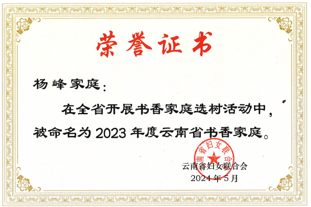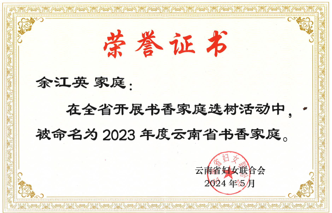近日,由云南省妇女联合会组织评选的2023年全省书香家庭揭晓,公司教职工余江英家庭、杨峰家庭荣获2023年云南省“书香家庭”称号。全省高校有20户家庭获此殊荣。