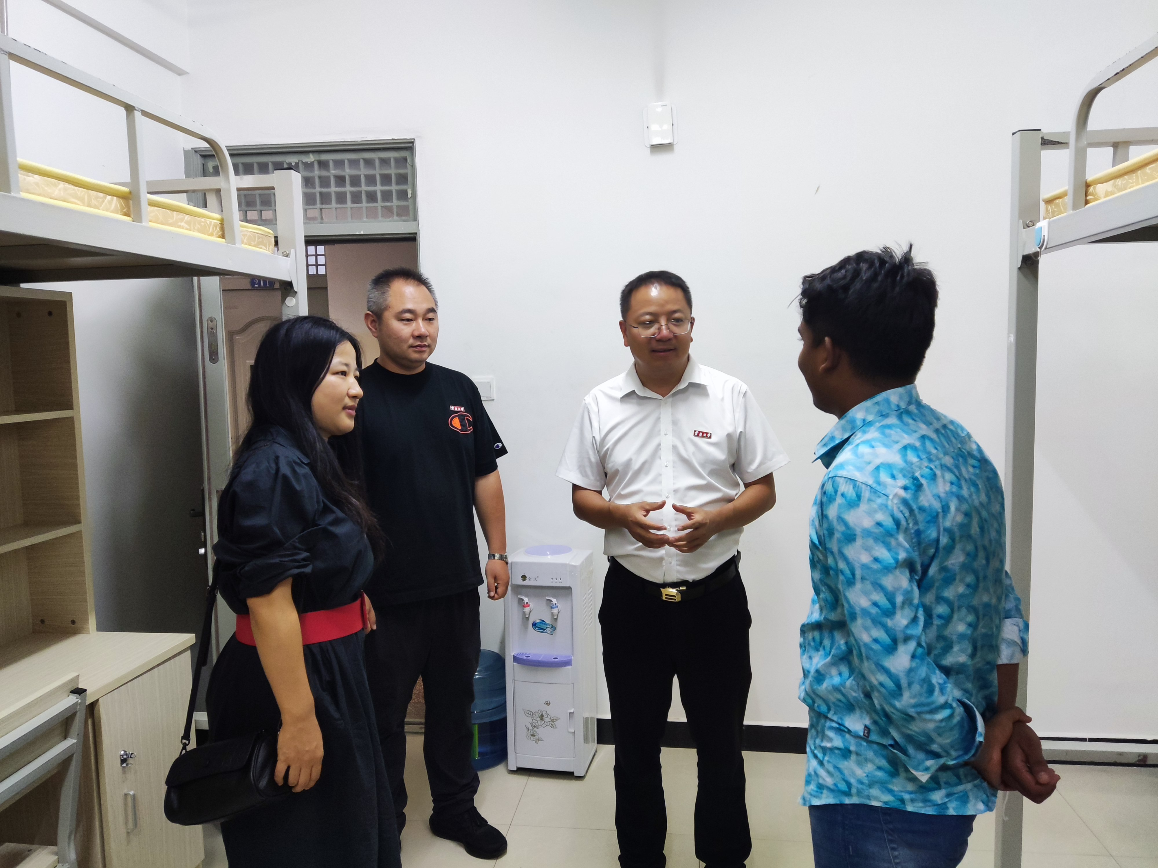 8月23日上午7:30,公司党委书记周学斌,副董事长廖炼忠,副校级领导丁恒道来到学院报到现场看望新同学,并迎接了从马尔代夫来报到的第1名国际员工。