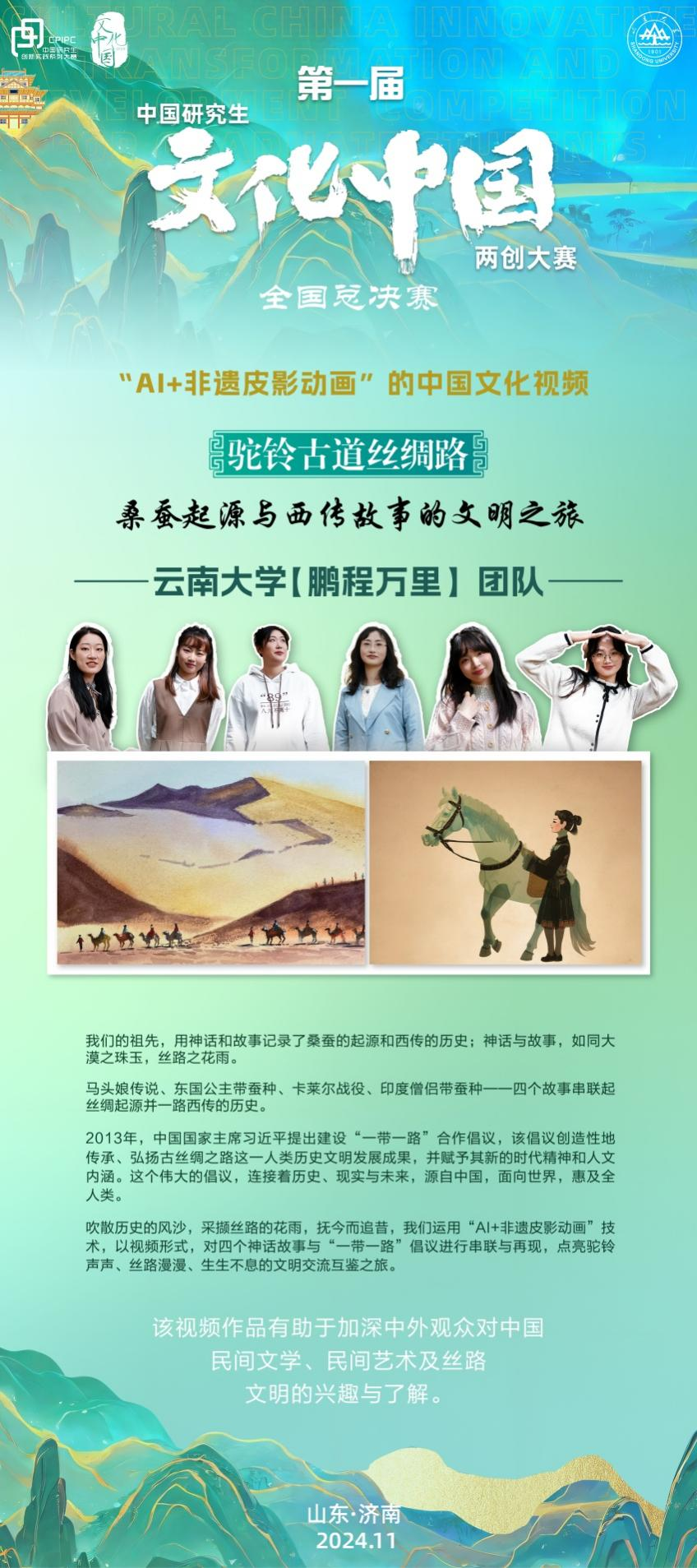 “鹏程万里”队围绕赛题五,遵循传承与发展的原则,以《驼铃古道丝绸路:桑蚕起源与西传故事的文明之旅》为题,运用“AI+非遗皮影动画”技术,以视频形式,以马头娘传说、东国公主带蚕种、卡莱尔战役、印度僧侣带蚕种四个神话故事为入口,再现了蚕桑文化一路西传,流布世界,丝路漫漫,生生不息的文明交流互鉴之旅。最后,作品结合“一带一路”倡议,阐述古丝绸之路新的时代精神和人文内涵。