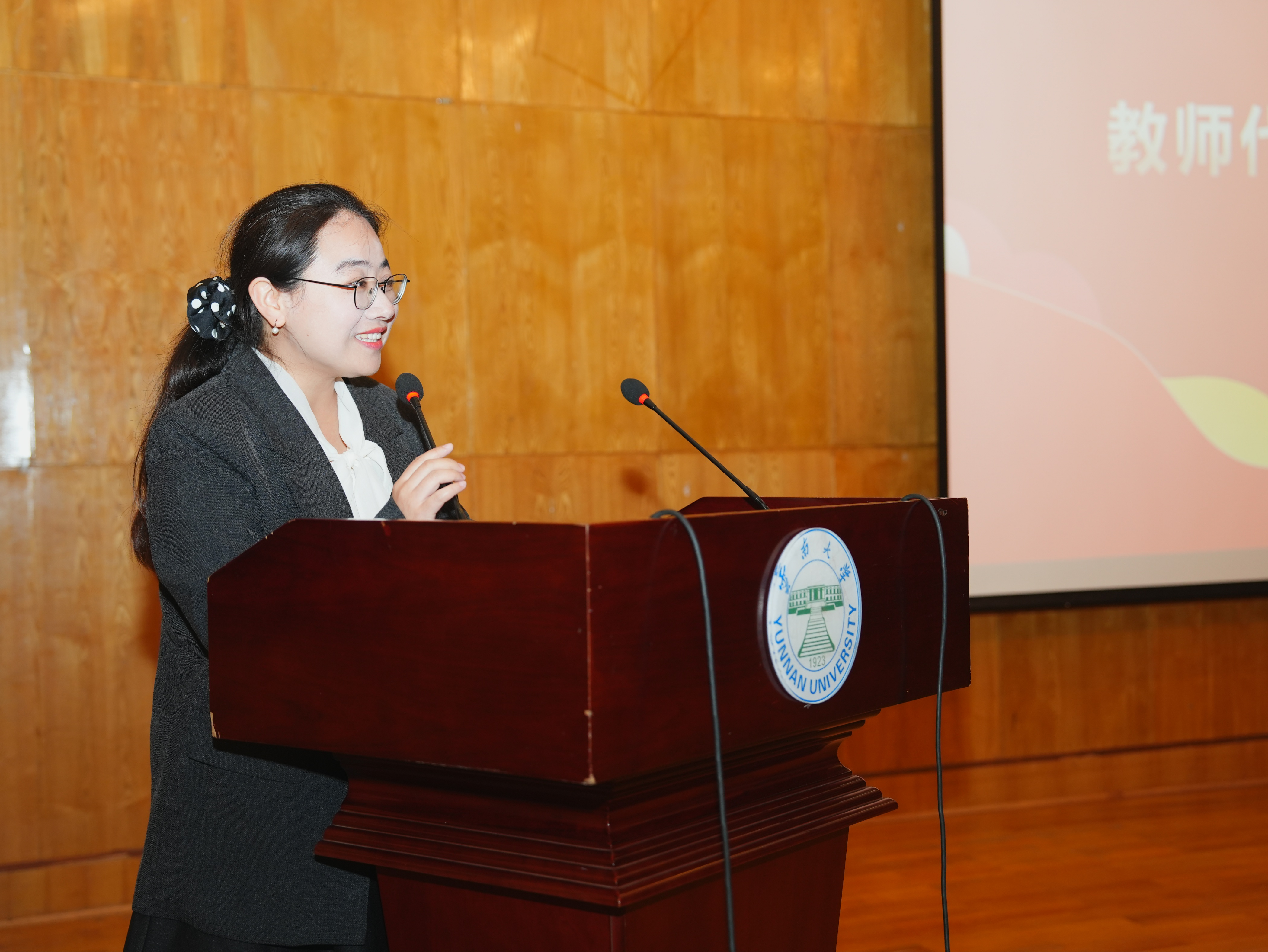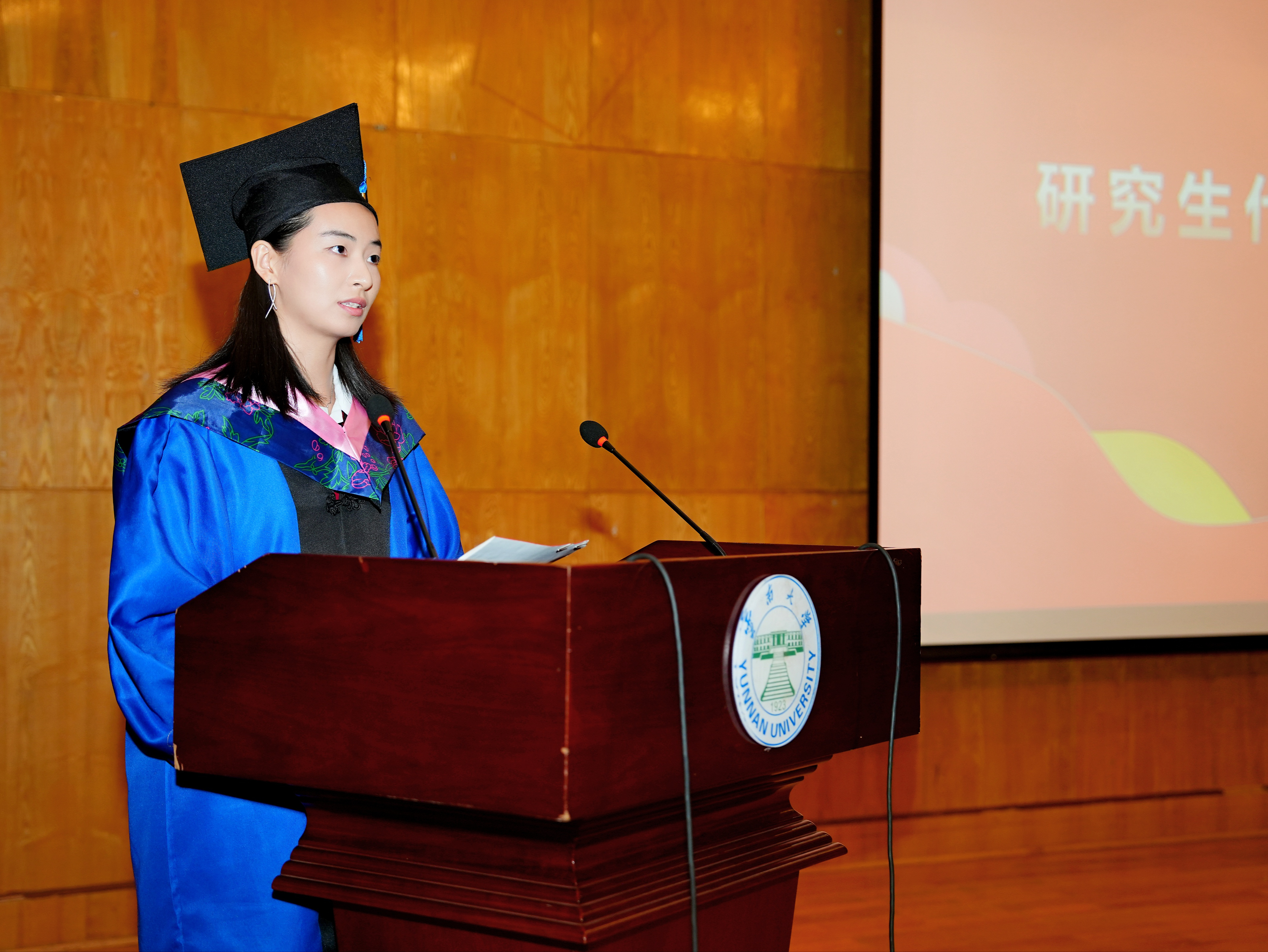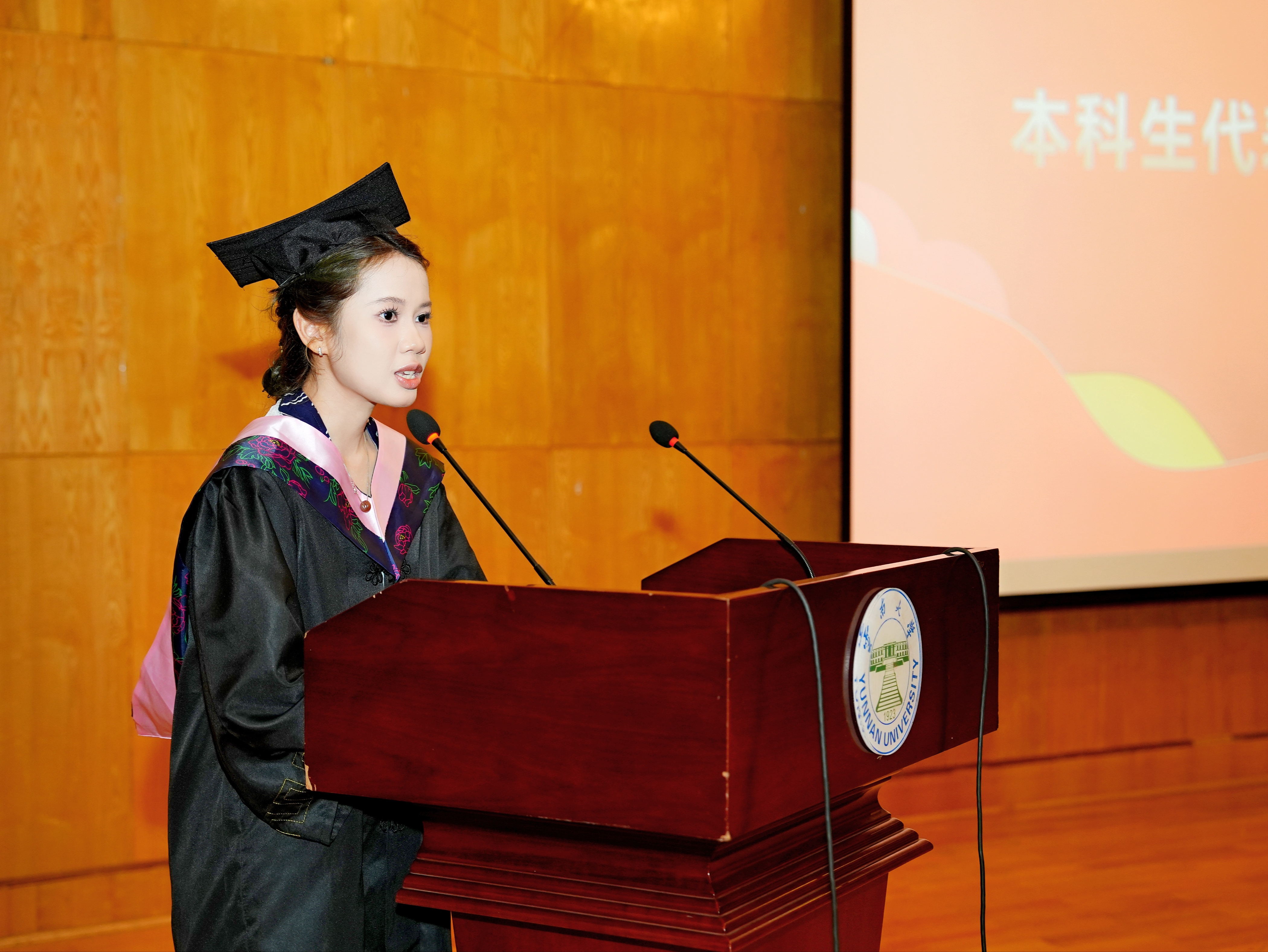 教师代表李晓露在毕业典礼上发言。勉励同学们找到自己的核心能力,用才能建立自己的“护城河”,遇到困难时,回想这段在云大汉教院的美好时光,一定能找到心中的定力,抵达想去的远方。