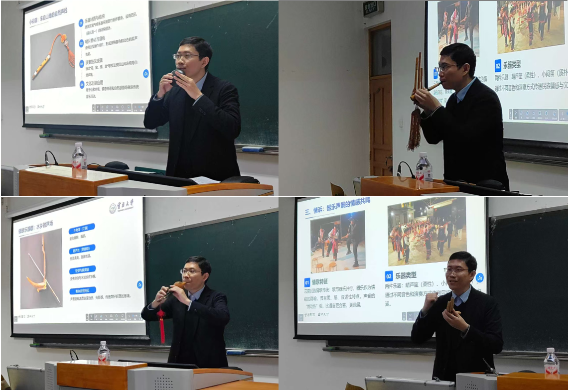 讲座现场,职工们沉浸于跨越山川的旋律之中,感受云南多姿多彩的声音图景。大家惊叹于不起眼的材质和普通的外观竟然在演奏家手里化腐朽于神奇,能够吹奏、弹唱出如此动人的旋律,引人入胜。邱健老师还亲自演奏葫芦丝、葫芦笙、埙等少数民族传统乐器,让抽象的文化和理论讲解化为可触可感的音乐符号。讲座让来自世界各国的同学们领悟到,民族器乐不仅属于历史,更是通向当代的桥梁。通过现场交流,各国青年认识到中国民族文化多样性和音乐文化的多元性与创新性发展。
