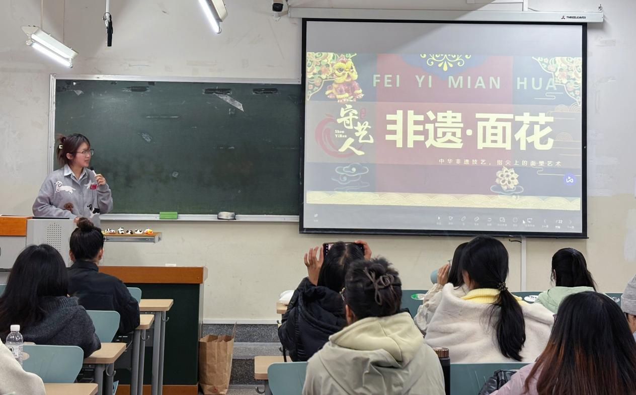 活动现场,团队负责人钱晨以“非遗·面花”为主题展开分享。通过高清图片、实物展示及中英双语讲解,详细介绍了面花的历史渊源、地域分布及文化寓意,重点解读了“龙凤呈祥”“年年有余”等传统造型中蕴含的民俗信仰与生活哲学,并联系当今社会出现的新面花造型,指出非遗面花所具有的时代价值。