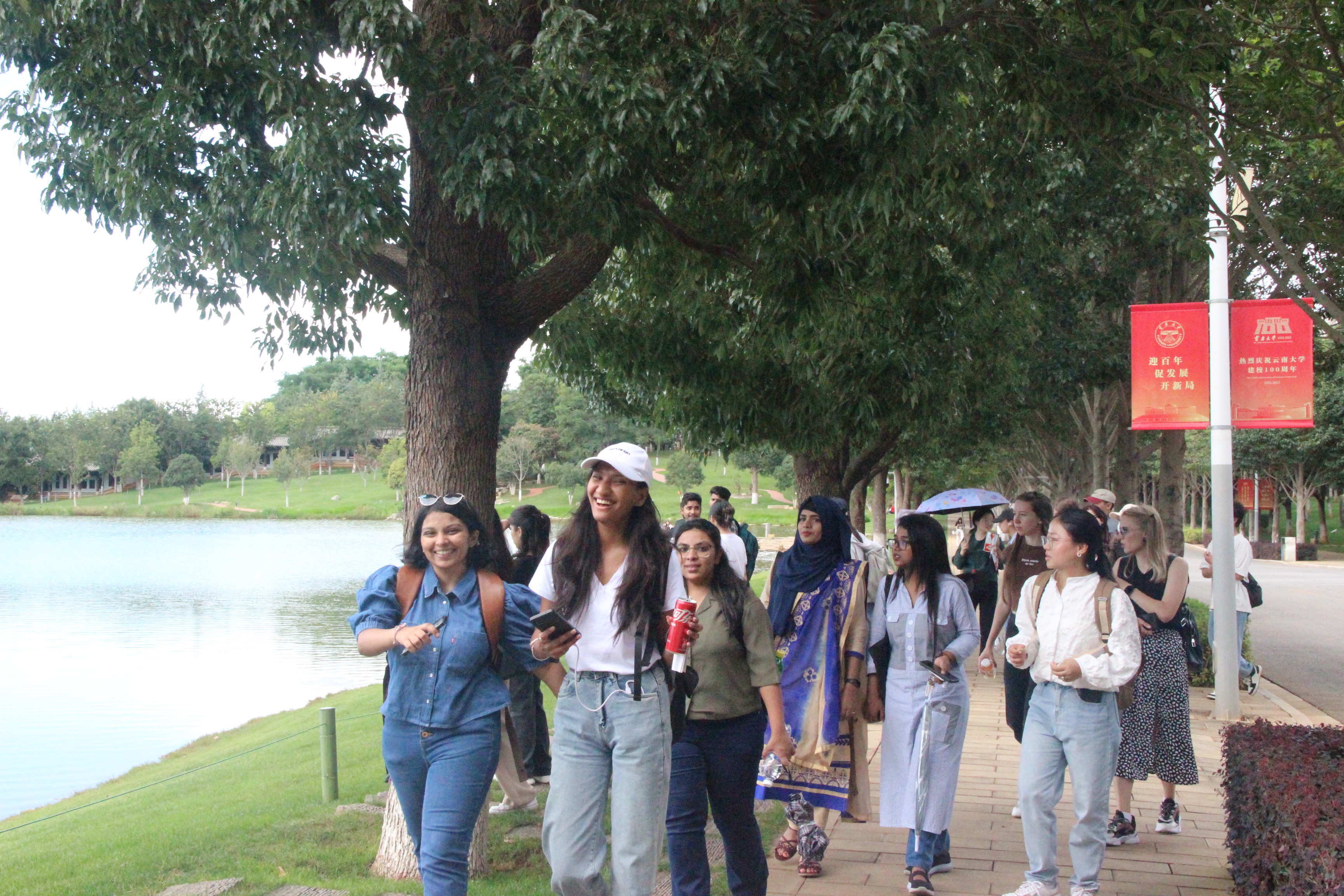 本次活动特别邀请到建筑与规划学院的喻佳泉老师为同学们讲解云大建筑的“前世今生”。在老师们的带领下,中外学子分成六组,从云大北门开始,一同游览打卡了云大的标志性建筑和地点。同学们参观了明远楼、云大钟楼、云山植物园,途径天文台、国家重点实验室、工程中心、植物温室等重要科研场所;路过东门文体中心到图书馆、云大会堂、泽湖及仿古建筑等校园特色地标建筑,最后回到北门,整个路线呈S 形蜿蜒曲折。